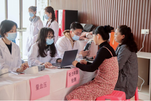 本次健康服务团队由康复医学系、听力与言语科学系教师代表和“康复医学系梦之翼志愿队”“听力与言语科学系启音志愿服务队”组成,开展了肩颈理疗,艾灸调理,手法放松,外耳、中耳检查,听力年龄测试、量血压及健康咨询等多项服务。